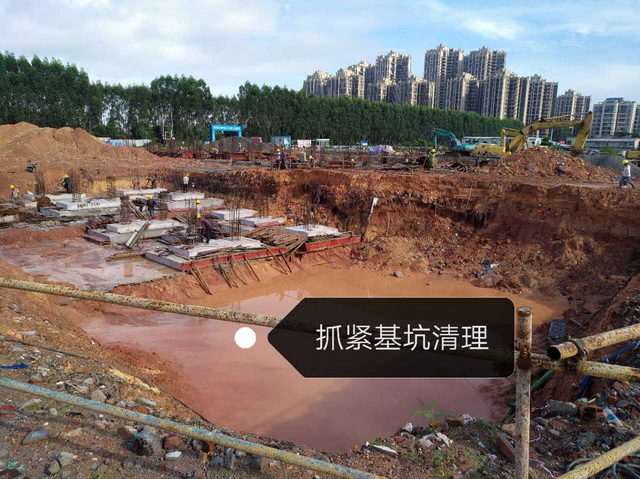 近期連續(xù)的大雨、暴雨,嚴重影響了施工。將挖好的基坑給泡了,項目部領(lǐng)導和工程師們檢查現(xiàn)場,并在雨停后指揮工人趕快抽水、排水,搶救被泡的基坑。